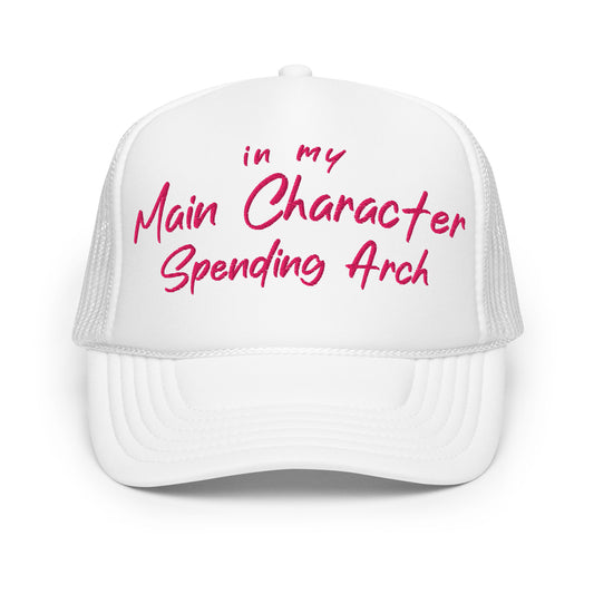 Main Character Spending Arch | Funny, Casual, and Cute Adjustable and Embroidered Foam Trucker Hat | White & Pink Colors