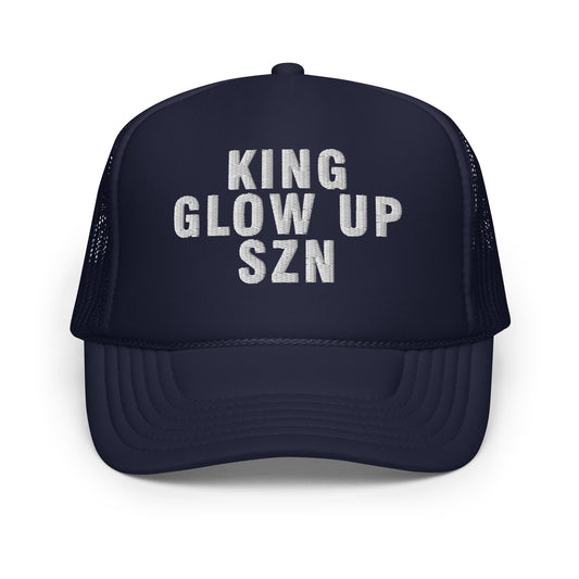 King Glow Up Season | Funny and Trendy Foam Trucker Hat - Black/Navy, Adjustable, Snap Enclosure